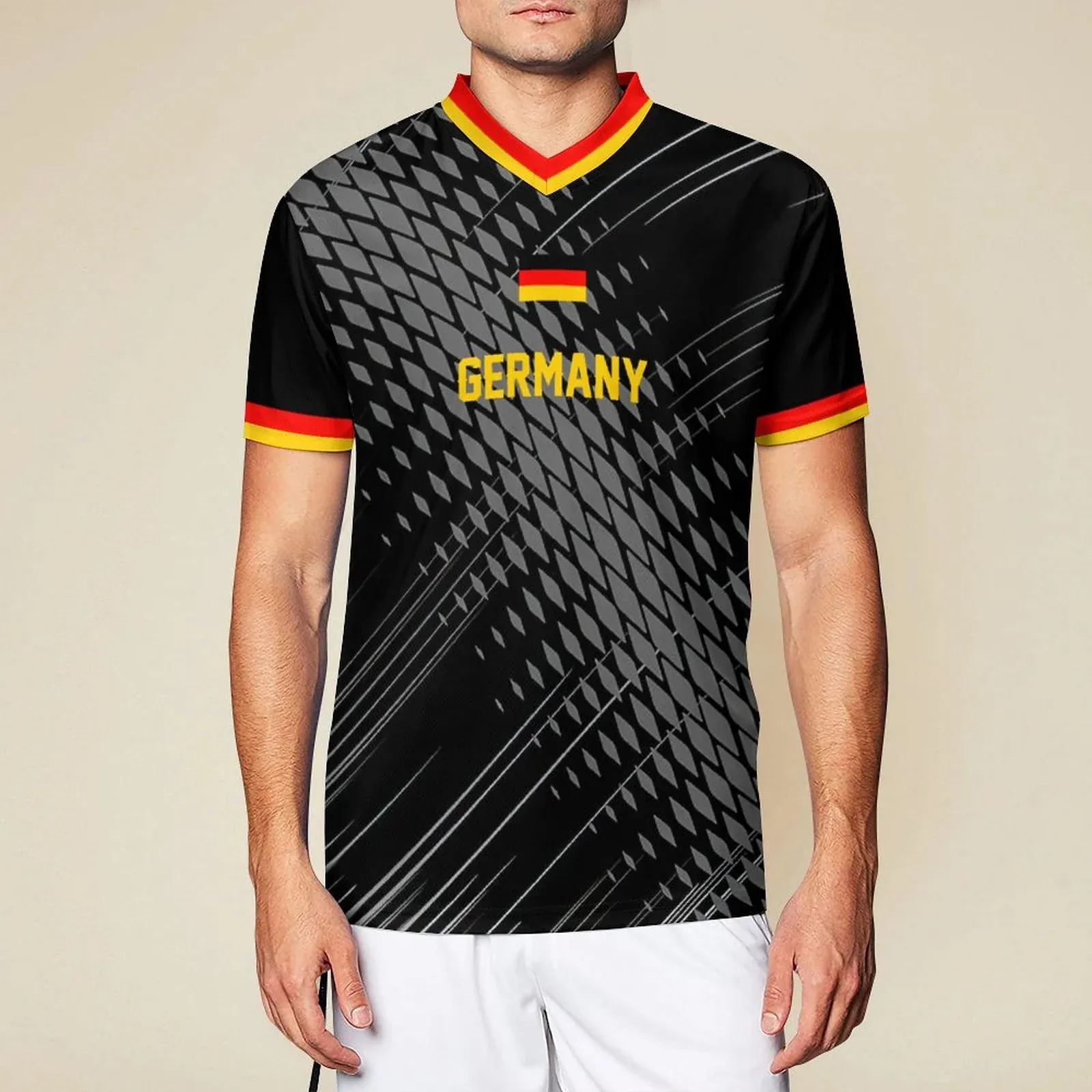 2022 / 2023 Maillot de foot personnalisé pour homme et Coupe personnalisé avec photo logo texte motif. Les bords-côtes extra larges vous offrent un maintien particulièrement bon lorsque vous bougez et empêchent le maillot de glisser. Le subtil décolleté en V est un autre atout visuel. Grâce à la fonction Keep Dry, l’humidité est transportée vers l’extérieur pendant le sport et le tissu sèche particulièrement rapidement.