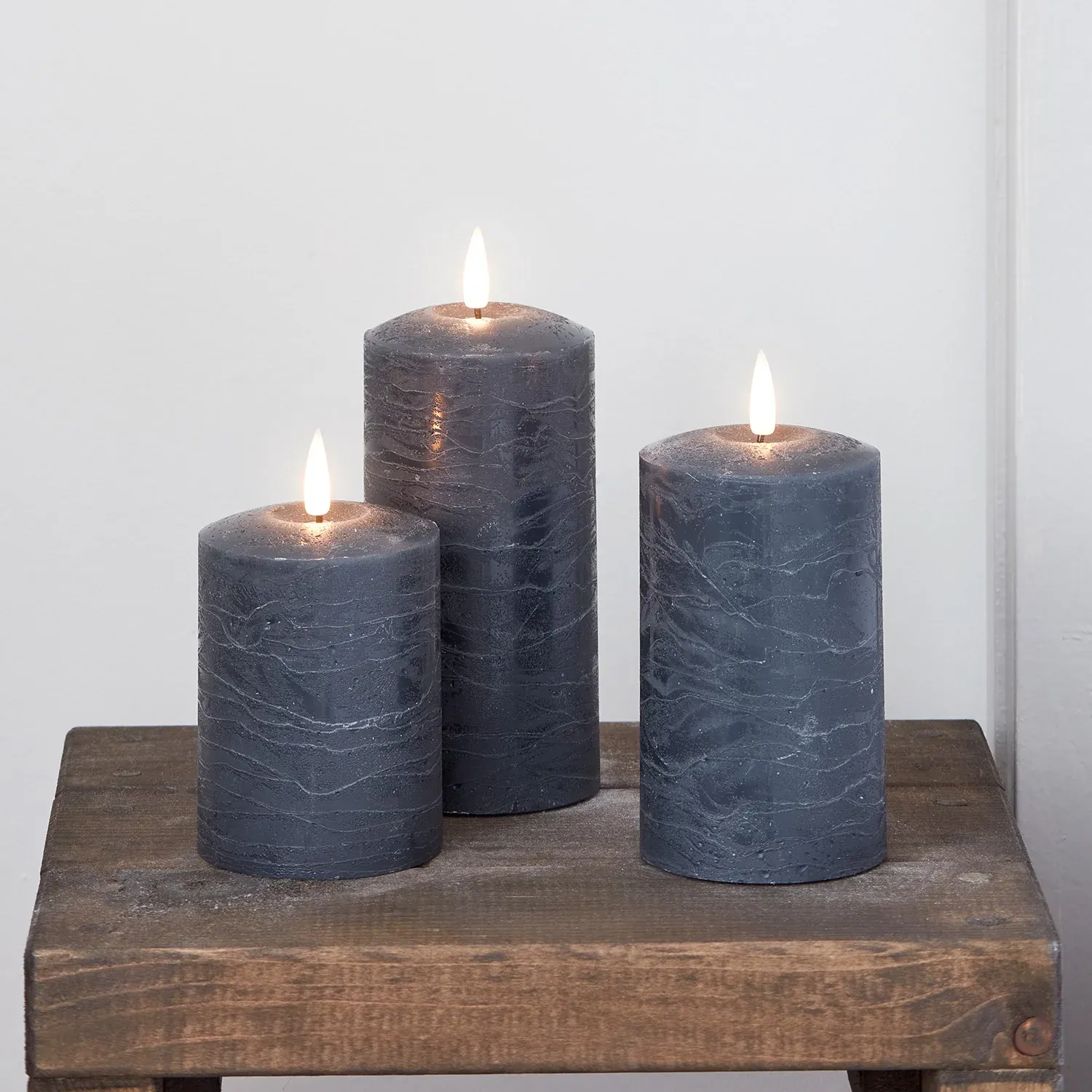Stylisez votre décoration d’intérieur d’une touche moderne avec ces bougies piliers TruGlow®. Avec leur finition gris foncé marbré, elles sont incontournables ! || Combinant de la vraie cire coulée à la main à une technologie innovante, ce trio de bougies donne l’impression d’avoir été tout juste allumé et ressemble à s’y méprendre à de vraies bougies. Déclinées en trois tailles différentes de 10, 12,5 et 15 cm, les bougies requièrent 2 piles AA chacune pour être allumées. Utilisez la minuterie de 6 h pour profiter d’une lueur douce à la maison, sans lever le petit doigt.