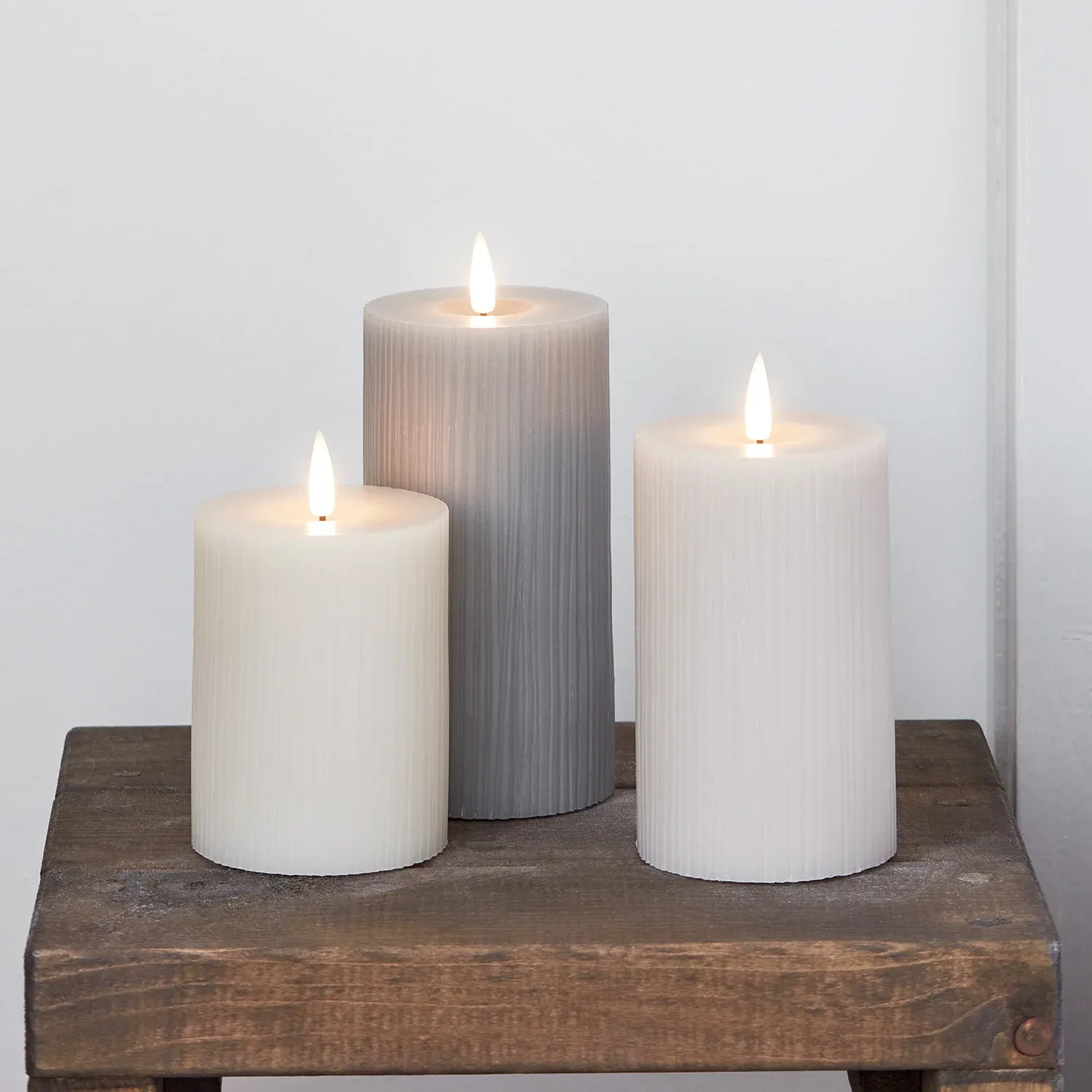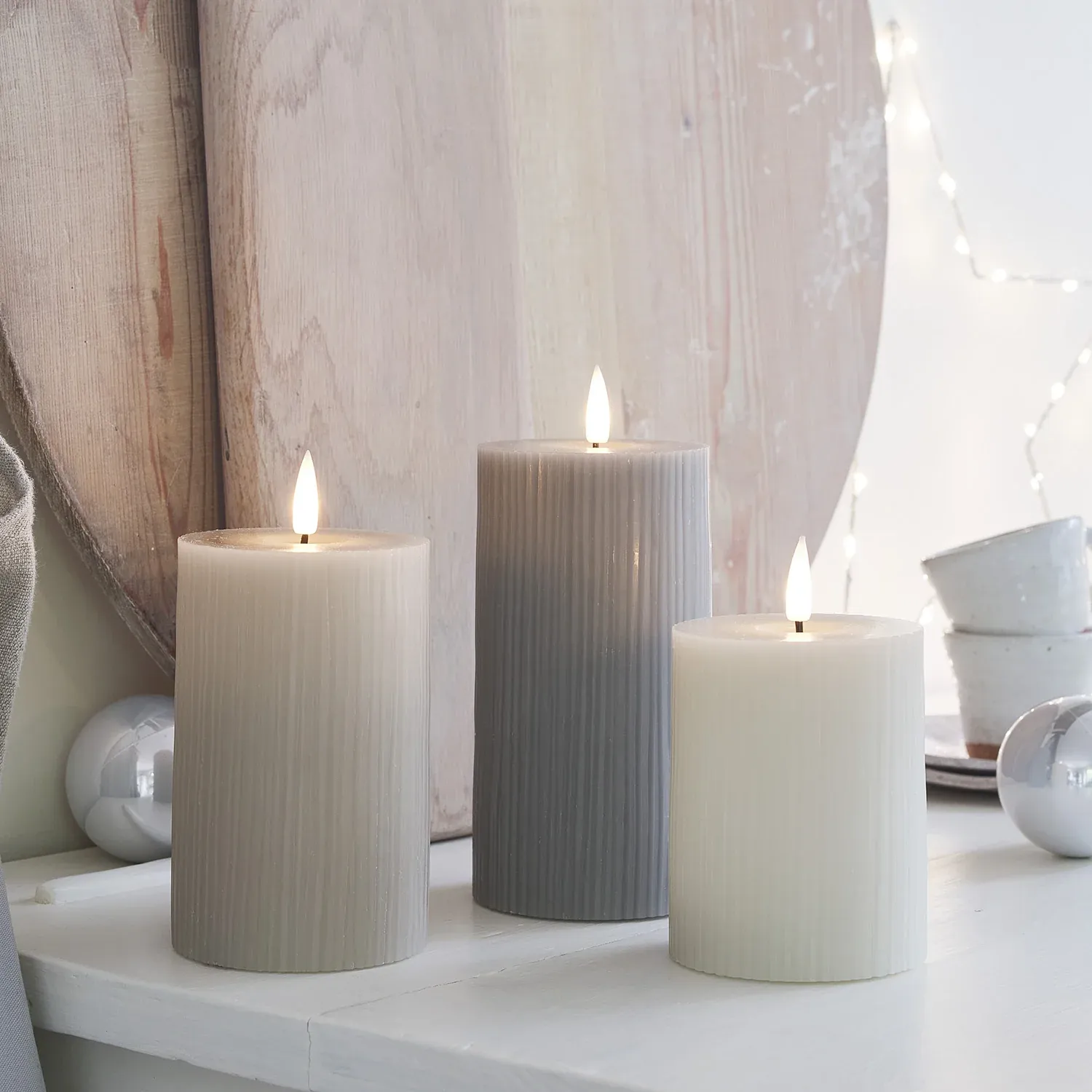 Ces bougies piliers TruGlow® aux tons neutres sont une version moderne de notre collection classique de bougies TruGlow®. Dans une finition délicatement côtelée et des tons doux de gris, ces bougies sont les accessoires parfaits pour décorer votre intérieur ! || Conçues dans de la vraie cire coulée à la main et dotées d’une flamme vacillante à LED qui leur donne l’air d’avoir été tout juste allumées, elles n’ont rien à envier aux vraies bougies ! Ce trio est décliné en trois tailles différentes (10, 12,5 et 15 cm). Pour les allumer, insérez 2 piles AA dans chaque bougie et profitez de leur lueur chaleureuse à la maison. Avec une fonction minuterie de 6 h permettant de les allumer automatiquement tous les soirs, elles deviendront vite incontournables à la maison, tout au long de l’année !