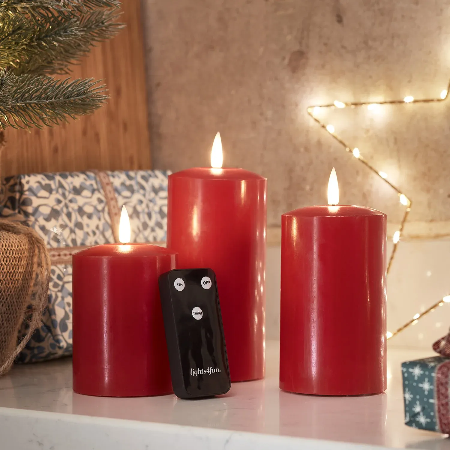 Nos bougies à l’éclairage innovant imitent à la perfection la lueur de vraies bougies. Avec leur cire rouge moulée à la main et la flamme fidèlement reproduite, elles sont élégantes tout en étant très sûres à utiliser. || En association avec une guirlande festive ou en centre de table, elles créeront une ambiance douillette grâce à leur lueur des plus réaliste. Insérez simplement 2 piles AA dans le boîtier prévu à cet effet et choisissez la fonction minuterie pour un éclairage automatique chaque soir à la même heure.