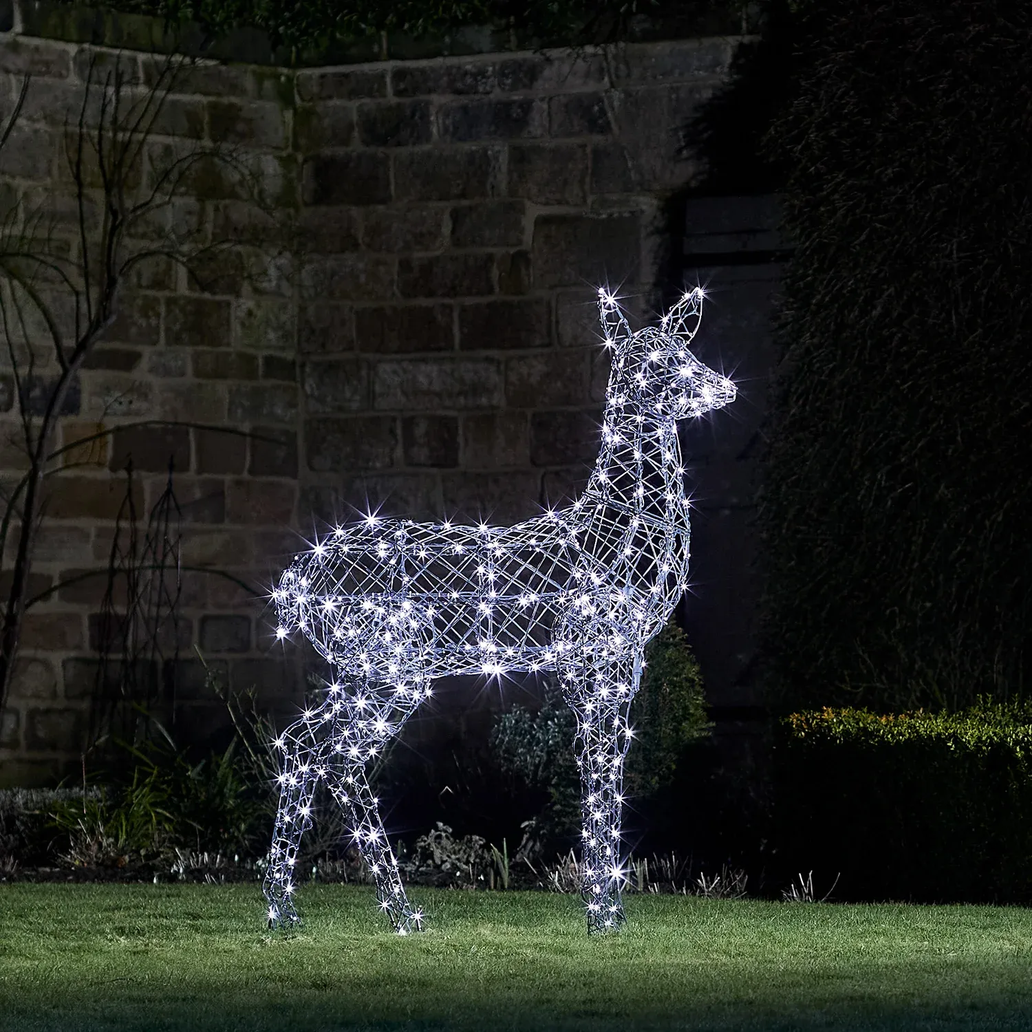 Notre grande biche Harlow sera la pièce maîtresse de votre déco hivernale ! Debout fière à 1,3 m de haut, elle est des plus élégante. Placez-la devant votre maison pour une entrée majestueuse et complétez le look en l’associant à notre grand cerf Harlow. || Munie de 300 LED, elle fait partie de notre gamme de rennes Harlow et, est dotée d’une nouvelle technologie innovante qui vous donne le choix d’illuminer votre produit de 2 nuances différentes du blanc au blanc chaud. Cette fonction exclusive vous permet de, soit associer votre produit à la couleur de votre installation existante ou de changer de couleur tout au long de la saison ! Totalement étanche, il ne vous restera plus qu’à vous assurer qu’elle soit bien fixée grâce aux crochets métalliques fournis et à choisir la fonction minuterie pour profiter de 6 heures d’éclairage chaque soir.
