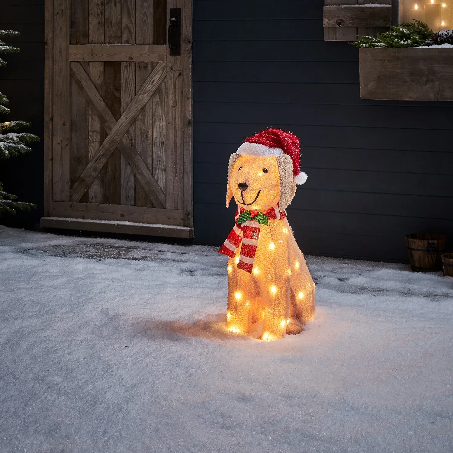 Ce joli labrador en peluche plaira à tous les amoureux des animaux ! Mesurant 72 cm de haut et doté de 50 LED blanc chaud, il est habillé d’une écharpe rayée et coiffé d’un bonnet de Noël et ajoutera un peu de caractère à votre maison en cette période de Noël. || Il trouvera parfaitement sa place sur votre porche ou au sein d’une plus grande installation dans le jardin. Étanche, il pourra être laissé dehors toute la saison. Branchez-le simplement à une prise grâce au câble pratique de 8 m et programmez la minuterie de 6 h pour qu’il s’éclaire à la même heure tous les soirs !