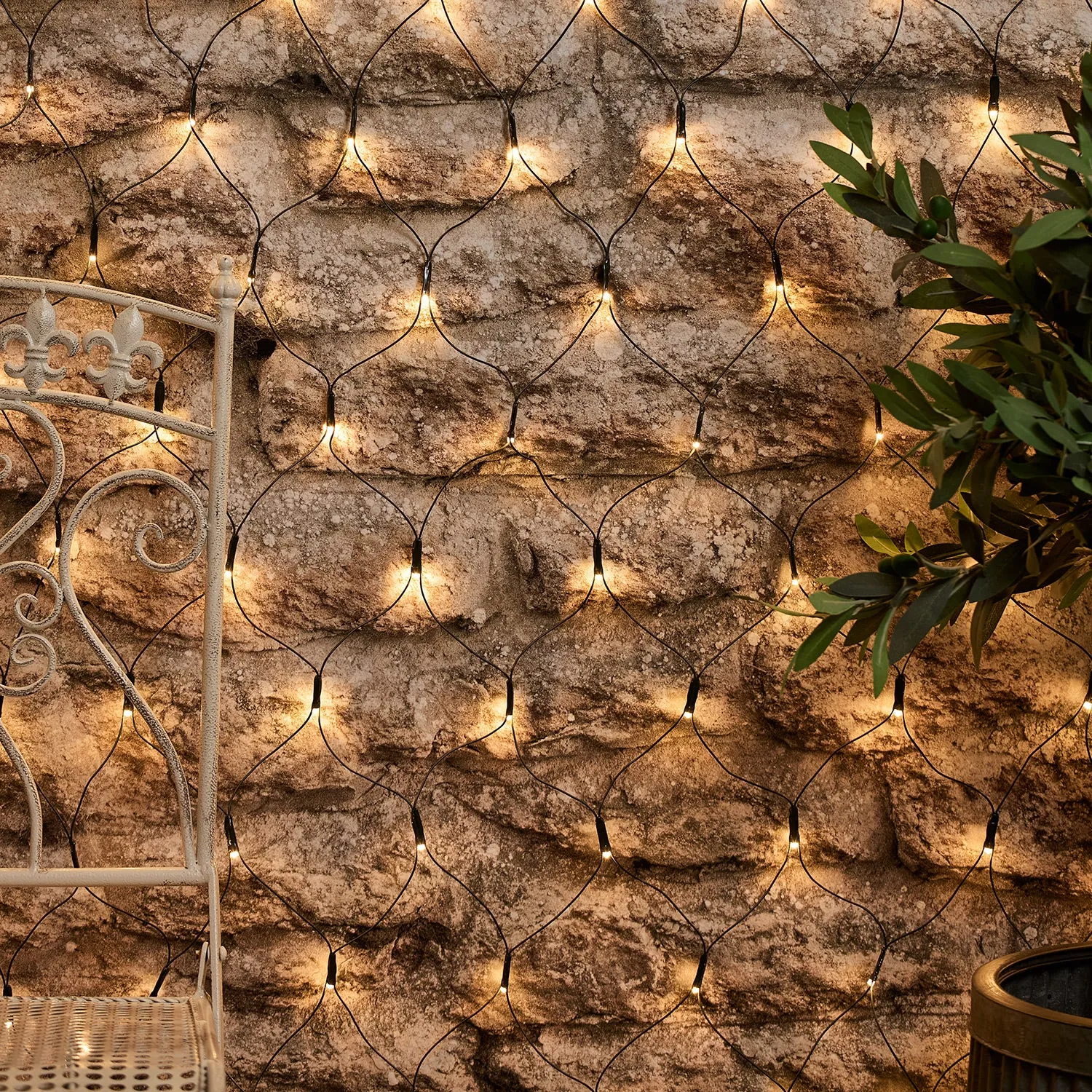 Instaurez une atmosphère conviviale lors de vos soirées estivales avec notre filet lumineux solaire. || Que ce soit pour des occasions spéciales ou comme éclairage permanent pour votre jardin ou balcon, Ce filet solaire illuminera vos espaces extérieurs avec élégance. Les 100 ampoules LED blanc chaud sont disposées sur un filet lumineux d’1 x 1 mètre, dans une teinte verte foncée. Avec un câble d’alimentation de 3 mètres, vous pouvez aisément installer le panneau solaire dans un endroit bien ensoleillé de votre jardin.