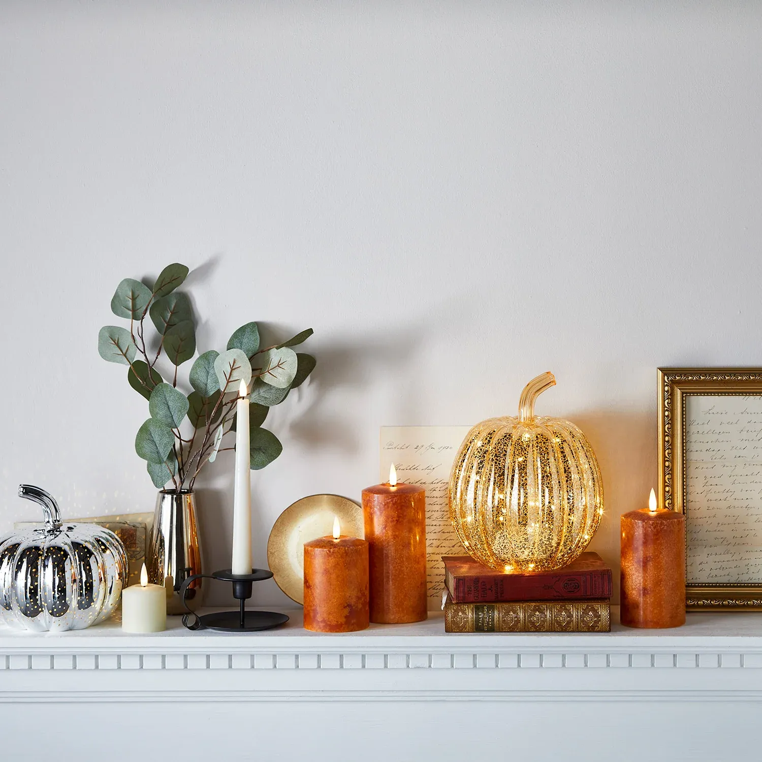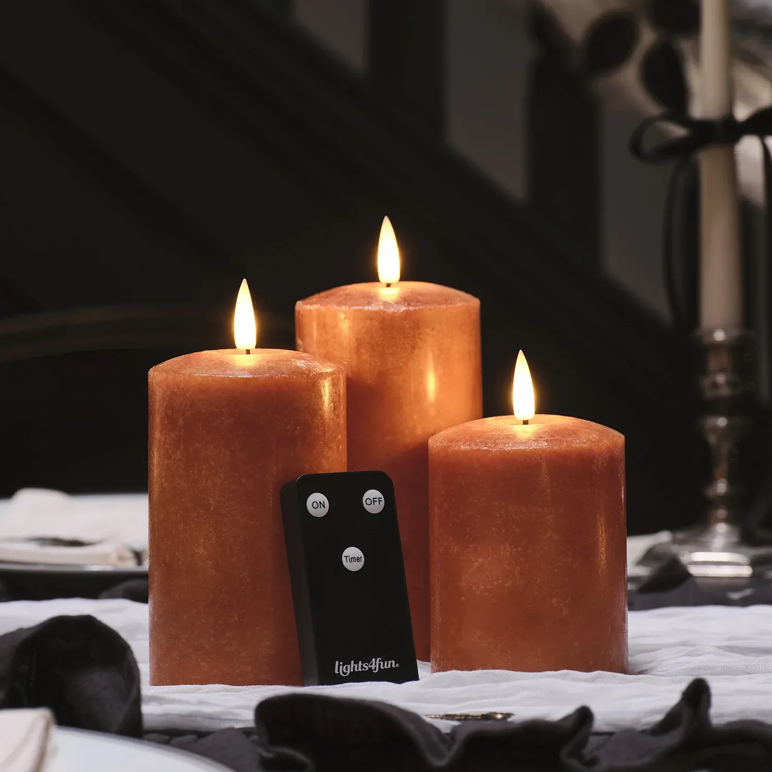 Ce joli trio de bougies TruGlow® allie cire moulée à la main et une technologie innovante pour un effet des plus réaliste ! Avec sa finition moucheté orange, ce lot sera idéal pour égayer votre déco automnale. || De tailles différentes, les bougies ont été conçues pour être présentées ensemble et seront parfaites pour créer un centre de table ou apporter une lueur chaleureuse à votre salon. Insérez tout simplement 2 piles AA dans la base de chaque bougie et choisissez la fonction minuterie pour un allumage automatique soir après soir.