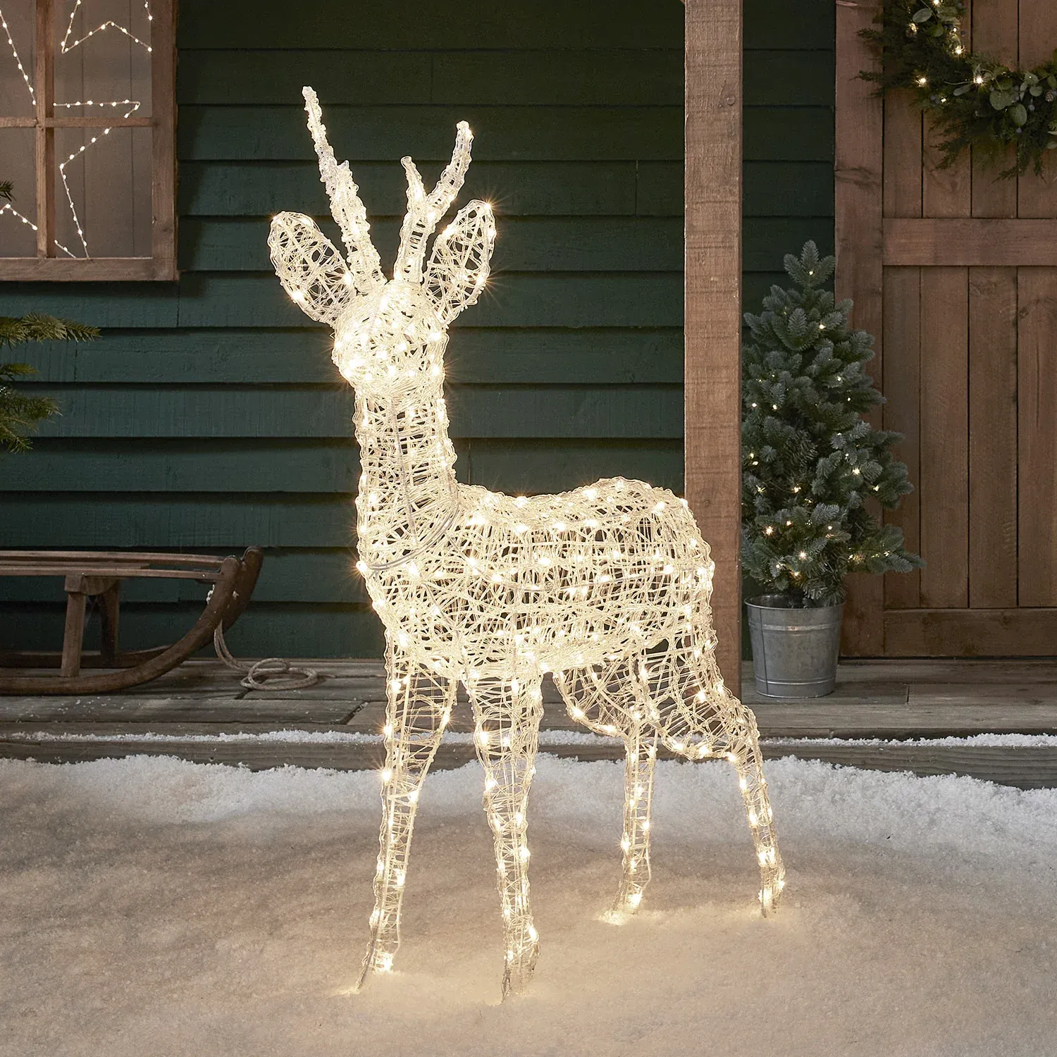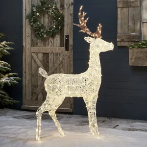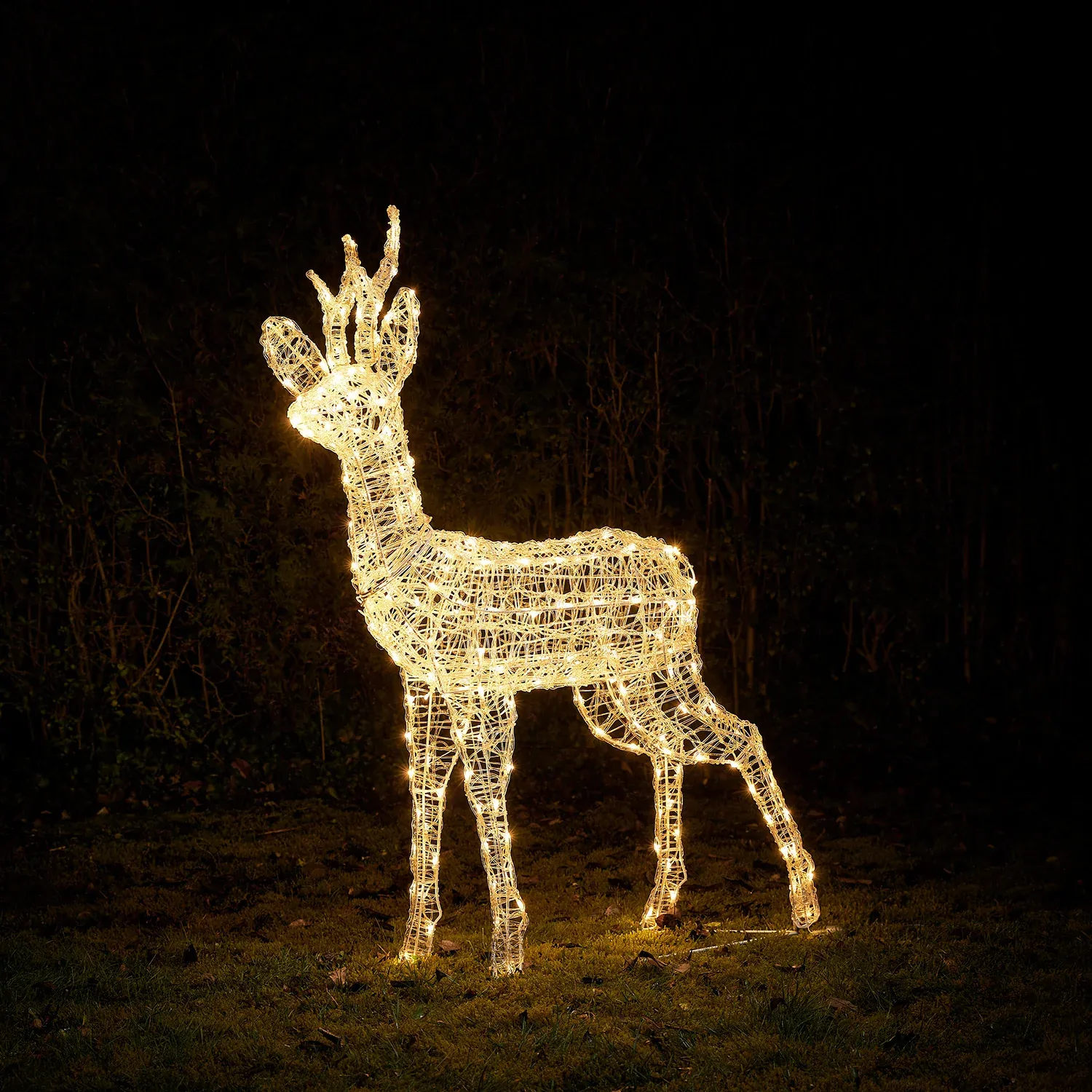 Impressionnez vos invités à Noël avec notre imposant cerf Swinsty ! Mesurant 1,25 m de haut et éclairé par 240 LED bicolores, ce cerf incontournable peut être illuminé en blanc, blanc chaud ou en un mélange des deux, vous permettant ainsi de créer un décor hivernal spectaculaire dans votre jardin. Le cadre fait à la main a été conçu en étudiant de véritables rennes et il est soigneusement enveloppé d’une couche d’acrylique transparent pour un aspect 3D et pour refléter les LED, offrant ainsi une lueur saisonnière éclatante. Le cerf dispose d’un câble d’alimentation de 8 m pour offrir plus de flexibilité. Vous pouvez l’installer séparément, ou avec la biche et le faon assortis pour avoir une famille complète de renne. Pour l’installer, branchez-le simplement, choisissez la couleur des LED et optez pour la minuterie optionnelle de 6 heures pour une illumination automatique à la même heure chaque soir.